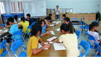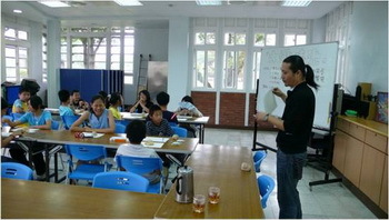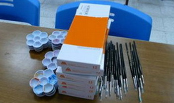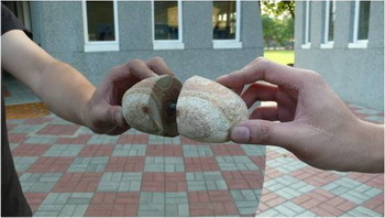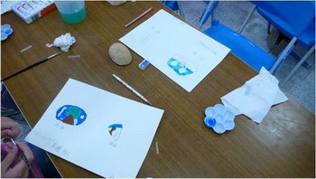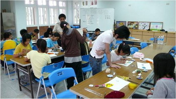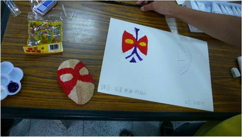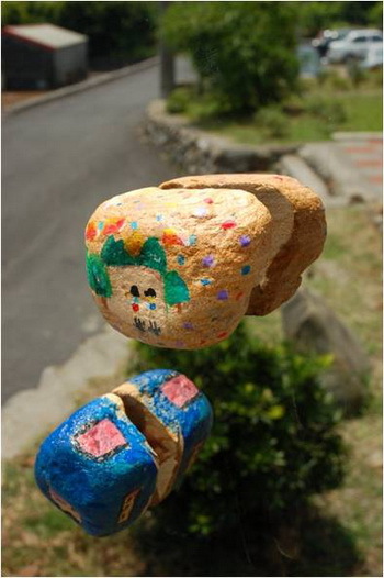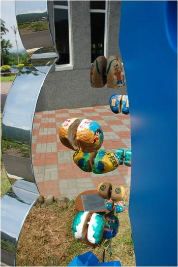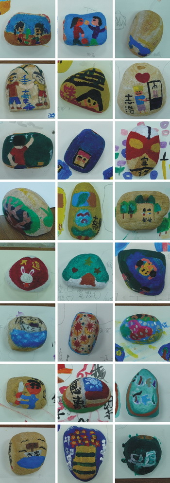 彩繪課程:由藝術家與勞作老師從旁指導,將剖半之原石提供給學生發揮創意來彩繪,並將成果安置於作品上,讓師生共同參與此次公共藝術創作。彩繪主題_『大進時光』 請小朋友們回想在大進國小學習與生活的點點滴滴選擇繪畫主題後,先在水彩紙上打好草稿練習著色,再將其繪製於剖半之原石。材料:壓克力顏料、尼龍彩筆、木紋石、水彩紙。時間:90分鐘